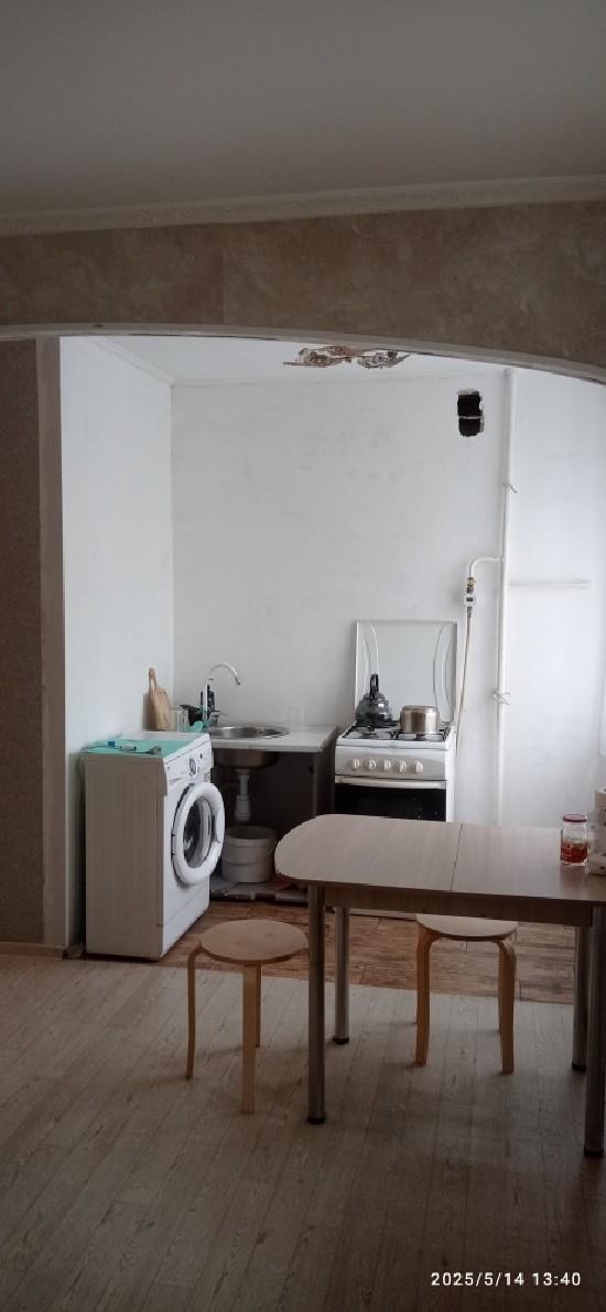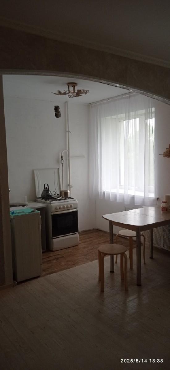 Зал соединен с кухней. Площадь около 25 кв м. Одна комната закрыта, Нет холодильника