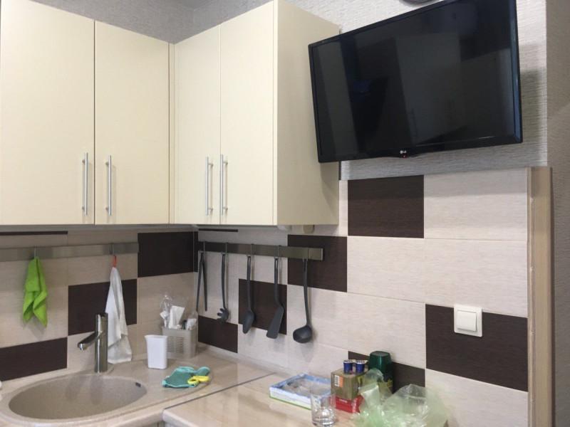 Большая гостиная-спальня, кухня. Всё для жизни: стиральная машина, холодильник, плита, кондиционер, ТВ, спальные места.
