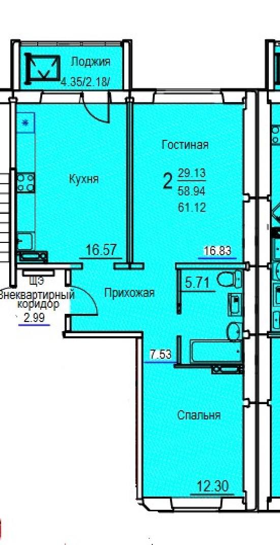 Площадь жилая: 29 Площадь кухни: 16.5
