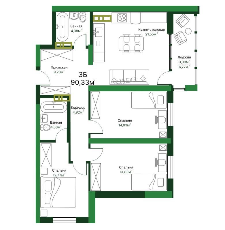 3-к. квартира, 88 м2