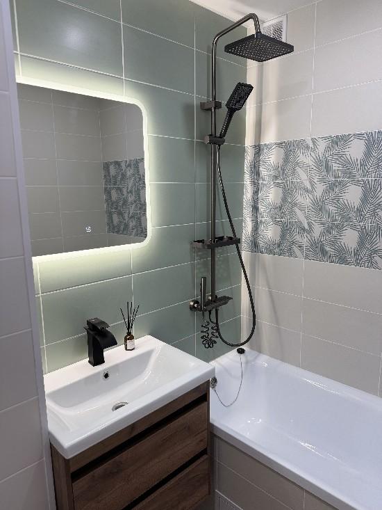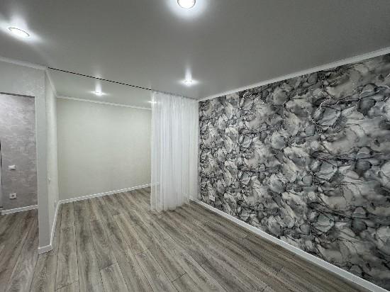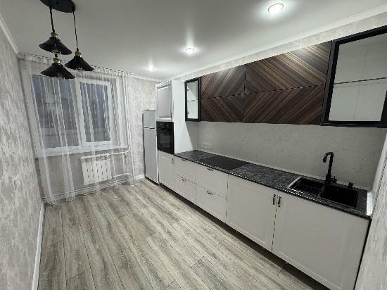 1 комнат квартира с новым ремонтом. в 16 квартале ленинградской планировки.Встроенная кухня,техника,натяж.потолки,в ванной идельный ремонт.замена проволдки,батерий,всех труб воды и канализации.