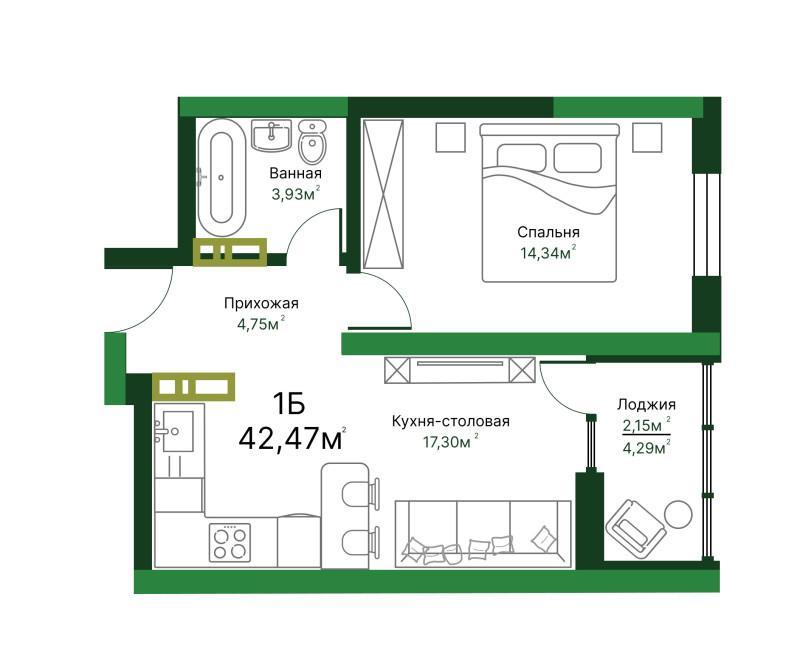 1-к. квартира, 42.61 м2