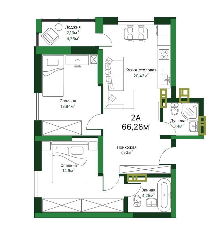 2-к. квартира, 66.56 м2